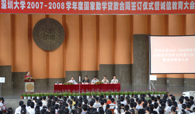 6月24日上午,深圳大學2007--2008學年度國家助學貸款合同簽訂儀式暨誠信教育大會在演會中心舉行。中國人民銀行深圳分行、深圳平安銀行等有關銀行負責人,李永華副校長,學生處、財務處負責人,各學院相關輔導員,745名享受助學貸款的學生出席儀式。