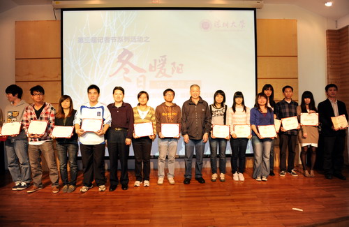 11月25日下午,深圳大學第三屆記者節系列活動之“冬日暖陽,你我同在”――與《深圳特區報》資深記者一起“直擊飛天夢”暨“荔園記錄者”、“飛揚文字”頒獎儀式在國際會議二樓咖啡廳舉行。我校黨委副書記陶一桃、深圳特區報新聞研究中心主任高福生、深度報道部主任沈清華、資深記者寧剛以及黨委宣傳部相關負責人出席了此次活動。