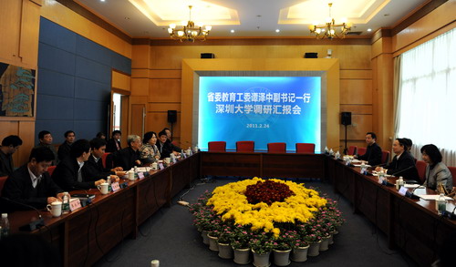 譚澤中詳細(xì)詢問了我校人事改革中的人員分類、崗位設(shè)計(jì)及競(jìng)聘、教師工作量、教授委員會(huì)設(shè)置等細(xì)節(jié)。他表示,本次來深大調(diào)研,主要目的是在當(dāng)前我省推進(jìn)事業(yè)單位人事制度改革、轉(zhuǎn)換事業(yè)單位用人機(jī)制的背景下,了解深大的相關(guān)改革做法和走在前面的經(jīng)驗(yàn),為我省高校進(jìn)一步推進(jìn)人事制度改革做好研究準(zhǔn)備。譚澤中希望我校繼續(xù)總結(jié)前一段的改革成功經(jīng)驗(yàn),在學(xué)校管理人員體制、學(xué)院職能運(yùn)作機(jī)制等方面做進(jìn)一步探索,為全省高校推進(jìn)人事制度改革積累、探索、分享更多的經(jīng)驗(yàn)。