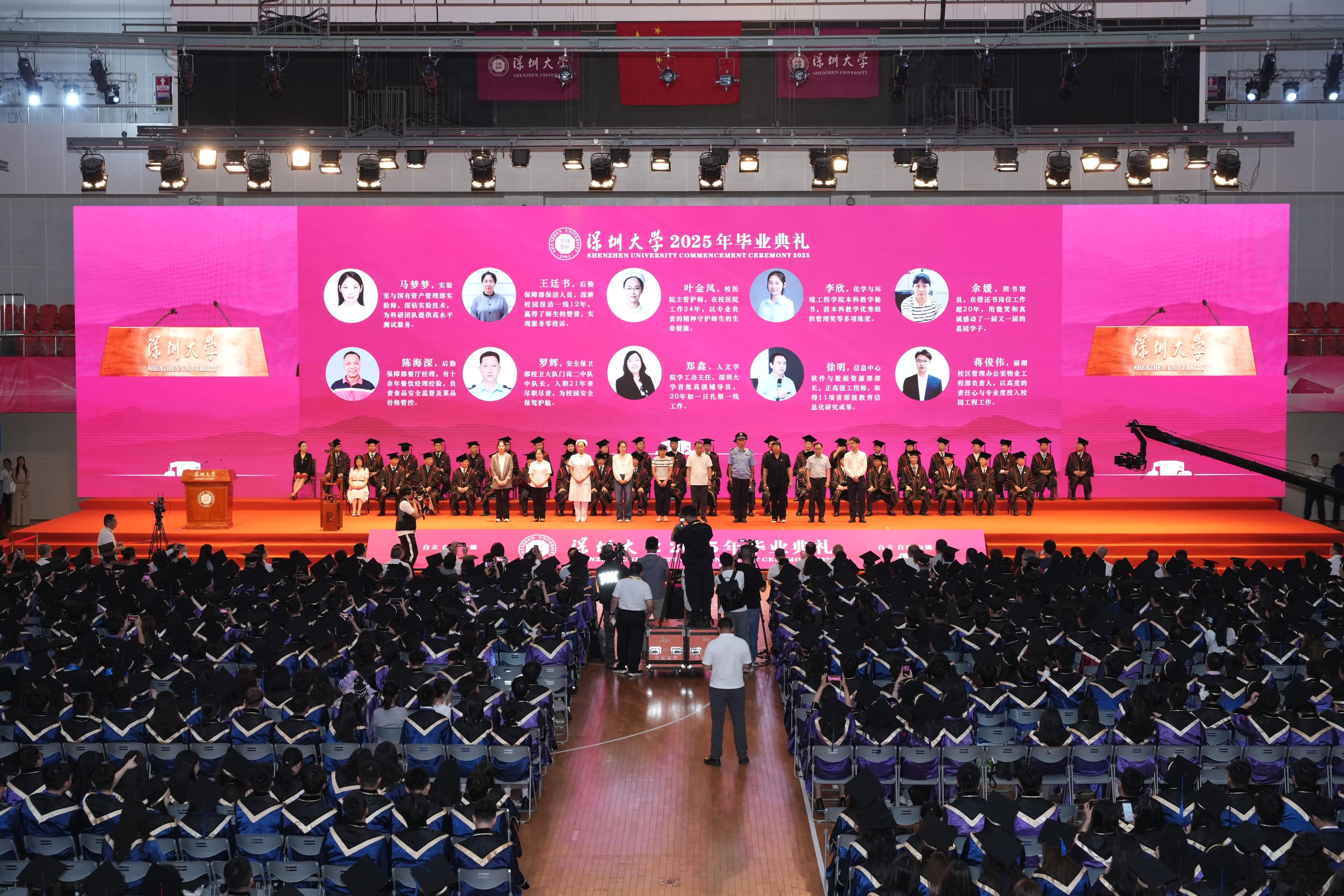 典禮上,李清泉為優(yōu)秀畢業(yè)生代表頒發(fā)表彰證書。毛軍發(fā)主持撥穗儀式并頒授學(xué)士學(xué)位、榮譽(yù)學(xué)士學(xué)位、碩士學(xué)位、博士學(xué)位。汪永成宣讀了深圳大學(xué)關(guān)于表彰優(yōu)秀畢業(yè)生的決定。周輝宣讀了深圳大學(xué)關(guān)于授予學(xué)士學(xué)位、榮譽(yù)學(xué)士學(xué)位、碩士學(xué)位及博士學(xué)位的決定。巢乃鵬介紹深圳大學(xué)2025年本科及研究生畢業(yè)情況。