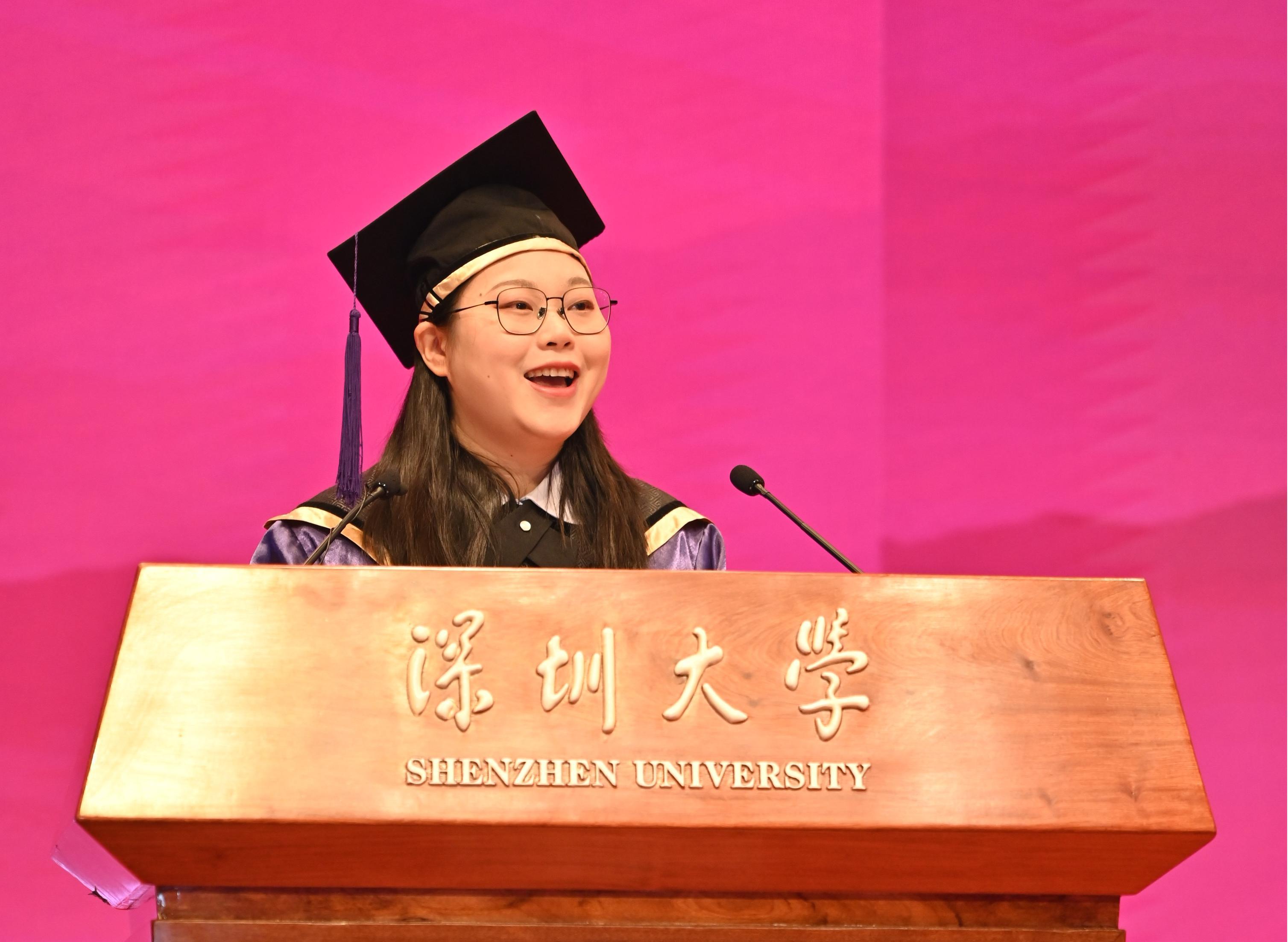 馬克思主義學(xué)院2025屆碩士畢業(yè)生李程代表畢業(yè)生發(fā)言。她說,作為成長于改革開放最前沿的學(xué)子,“闖的精神、創(chuàng)的勁頭、干的作風(fēng)”早已融入深大人的血脈。這份源自荔園的銳氣、活力與務(wù)實,是畢業(yè)生行囊中最珍貴的財富?!霸诔錆M無限可能和不確定性的時代洪流中,我們唯有主動鍛造個體內(nèi)在的‘確定性’,才能在風(fēng)浪中穩(wěn)立潮頭?!彼f,這份確定性,源于“勤學(xué)苦練”的理論功底、“知行合一”的實干力量和母校給予的堅實托舉。她喊話深大全體畢業(yè)生:“帶著‘自立、自律、自強(qiáng)’的校訓(xùn)精神,勇敢地去尋找自己的確定性吧!”